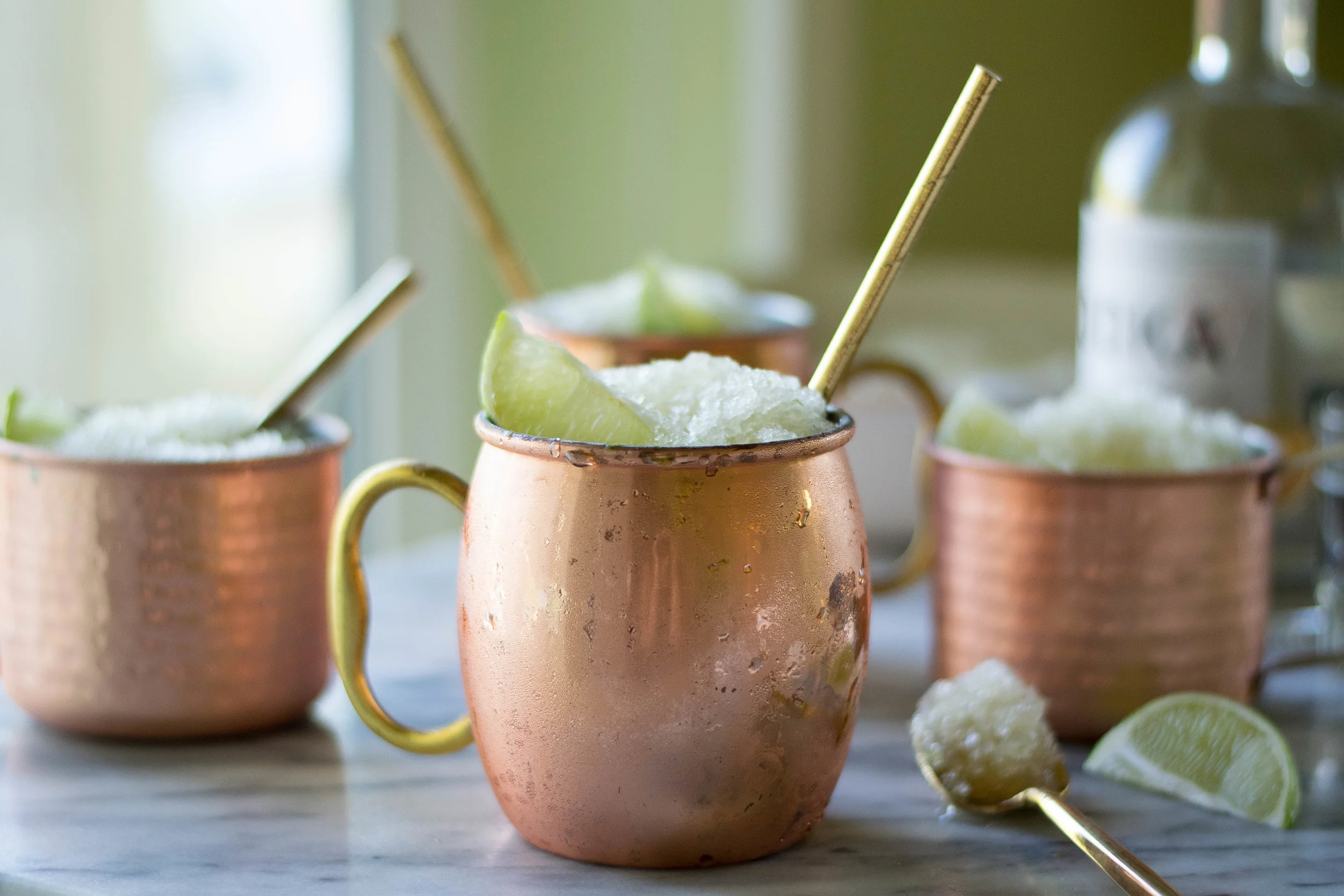 Scoop mixture into copper mugs, pour 2 oz vodka and 1 oz of lime juice over each mug and garnish with a lime wheel.