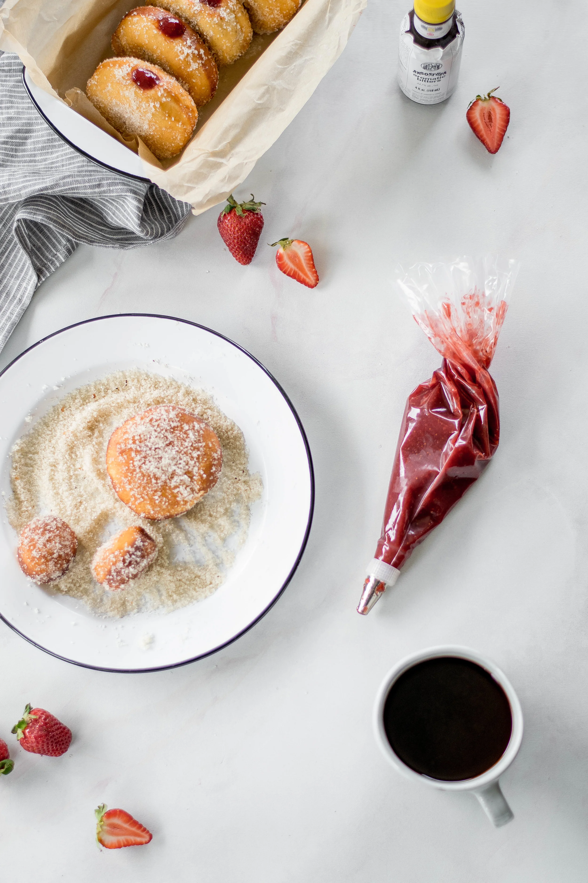 Alright, so let's talk more about THESE doughnuts. I got the idea for the filling from the latest issue of Bon Appetit. There was a little blurb from Claire Saffitz, one of the BA senior food editors, where she shared a genius tip about using angostura bitters in fruit jams and preserves to add a bit of flavor depth and complexity. What would normally be a wonderful flavor enhancer in a cocktail can also be the secret sauce in an insanely good fruit jam. The heady, spicy and herbal bitter notes in angostura bitters pair particularly well with sweet fruits, especially ripe Spring strawberries. Although, you could easily substitute raspberries or late Summer blackberries and both would pair deliciously with the bitters, too (can't wait to make a blackberry version once my parent's blackberries explode this Summer). Angostura bitters are made with a wide array of bitter herbs and aromatic spices, and by adding a little to a sweet strawberry jam, it makes the whole thing sing. This little jammy mixture happens to be the perfect filling for a fluffy, pillowy soft brioche doughnut.
